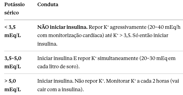 Por que não posso iniciar insulina antes de checar o potássio? Porque a insulina promove a entrada rápida de potássio do extracelular para o intracelular. Se o K⁺ sérico já estiver baixo (< 3,5), a insulina pode precipitar hipocalemia grave com risco de arritmias fatais. O potássio deve ser corrigido primeiro.