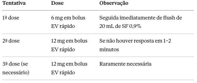 - Nunca aplique adenosina em veia periférica distal — a taxa de sucesso cai significativamente.
